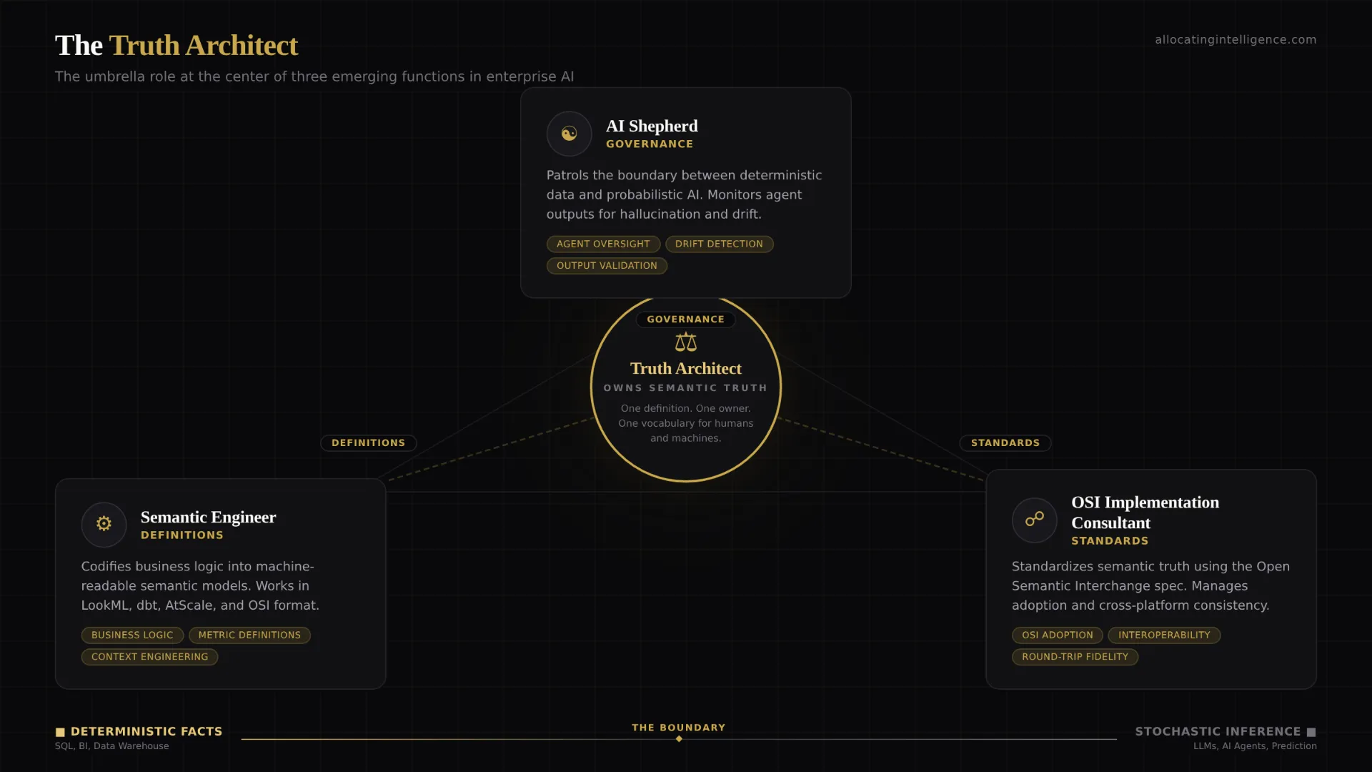The Semantic Engineer builds the bridge by codifying business logic into machine-readable semantic models. The OSI Implementation Consultant standardizes that bridge across the organization using open standards. The AI Shepherd patrols the bridge, monitoring what crosses from the world of facts into the world of stochastic inference and intervening when something goes wrong.